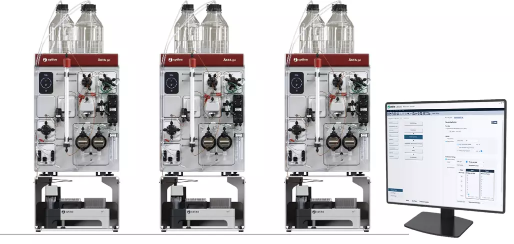 Fig 1. In this study, three ÄKTA go™ chromatography systems were operated in parallel controlled from a single UNICORN™ client to evaluate reproducibility and workflow efficiency for integrated affinity capture and desalting of antibody samples.