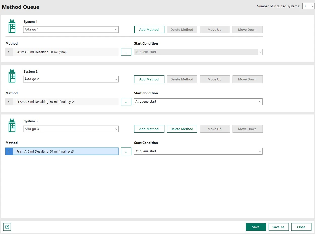 To ensure straightforward operation across all three ÄKTA go™ chromatography systems, Method queues were used to start the workflows from a single command (Fig 2). This setup simplified operation by allowing all systems to be initiated together from one interface, reducing manual steps and making the workflow easier to manage.