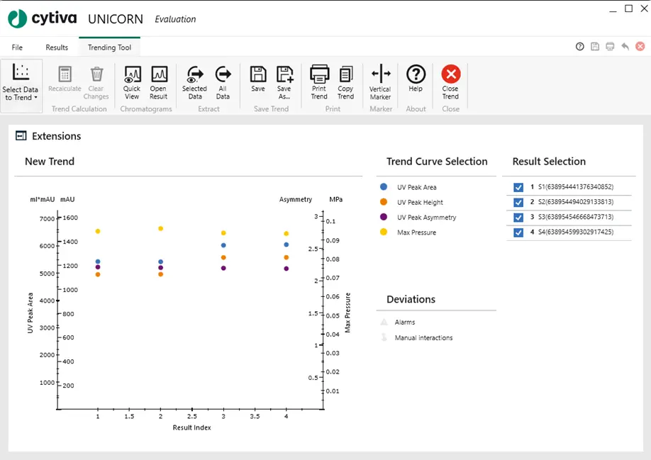In addition to standard evaluation tools, the workflow incorporated the Trending Tool 2.1, which compiles key parameters such as UV peak shape, column pressure, and conductivity into comparative plots for quick assessment of column health and run‑to‑run consistency. This supported rapid evaluation of reproducibility and helped identify any deviations during the multi‑step purifications.