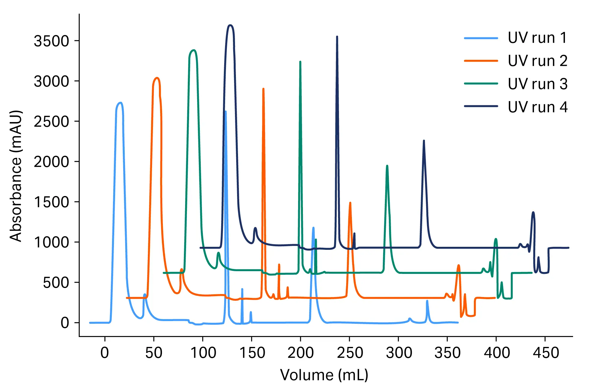 Fig 5. Representative comparison of chromatograms for ÄKTA go™ 1 runs (Runs 1–4) using the Evaluation module. Overlay of the first four runs illustrate consistency in chromatographic performance.