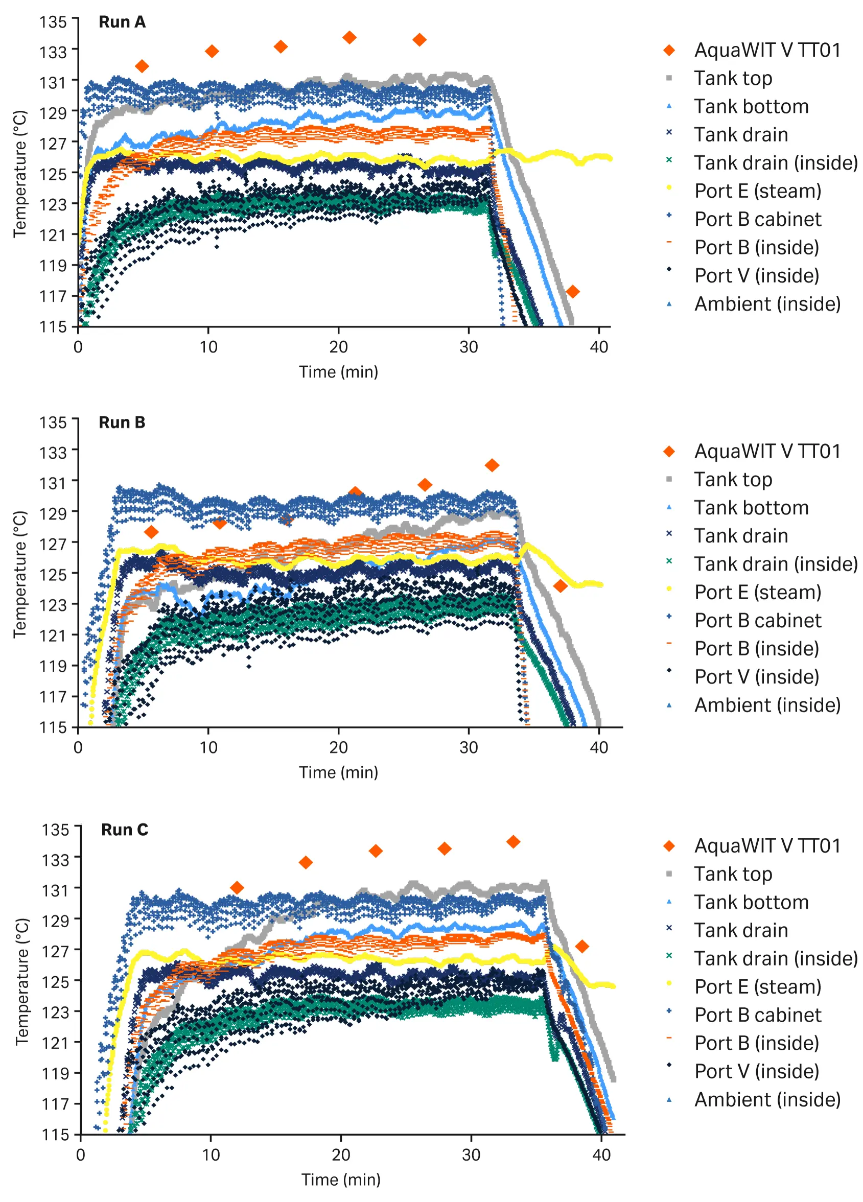 The target temperature (125°C) refers to the AquaWIT TT01 internal sensor, where the temperatures we measured were above the target.