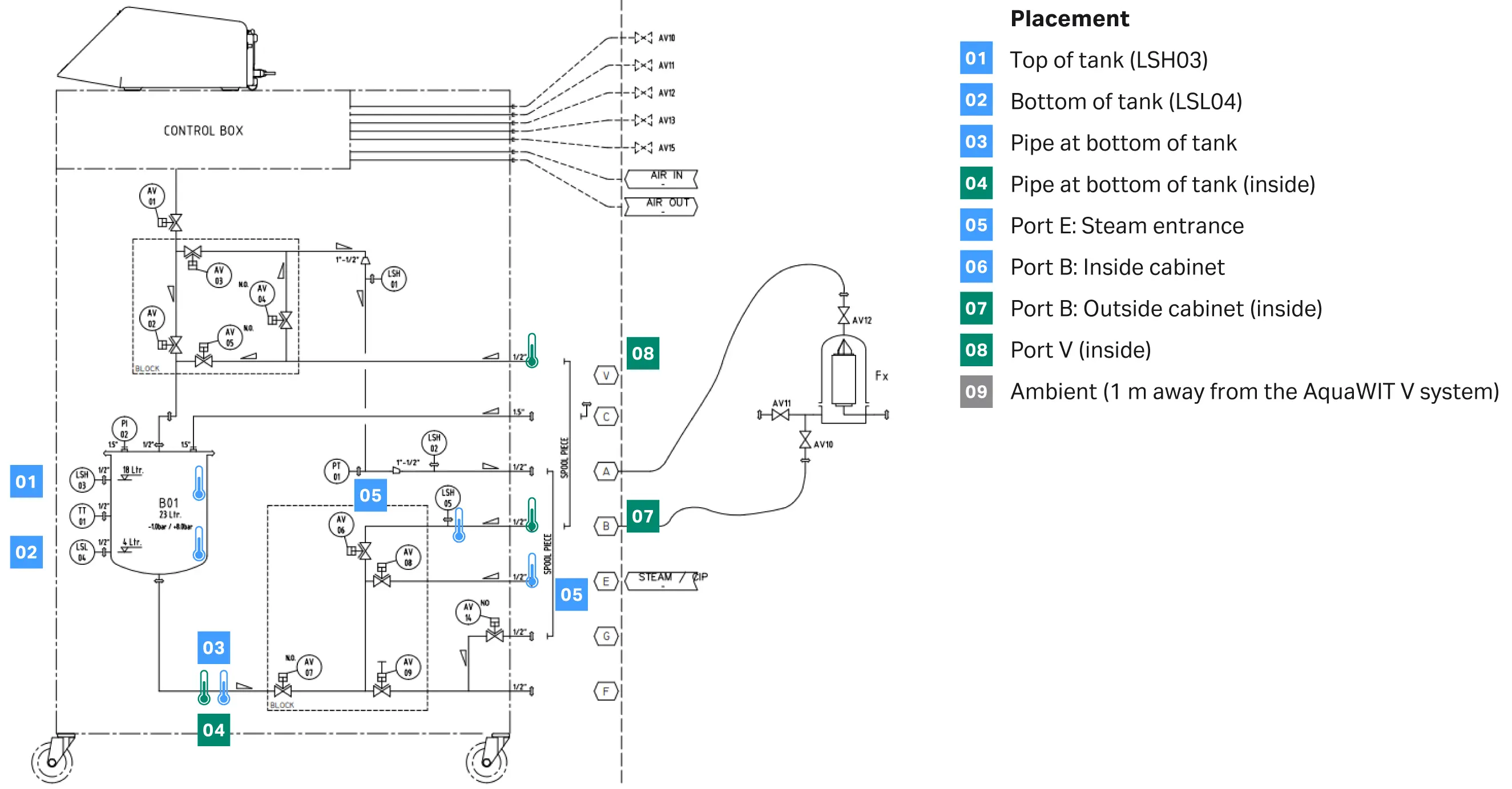 For three positions, we inserted sensors inside the piping using cut seals (nr. 04, 07, and 08). Figure 2 displays the temperature mapping, where the thermocouples are attached on the AquaWIT V system.