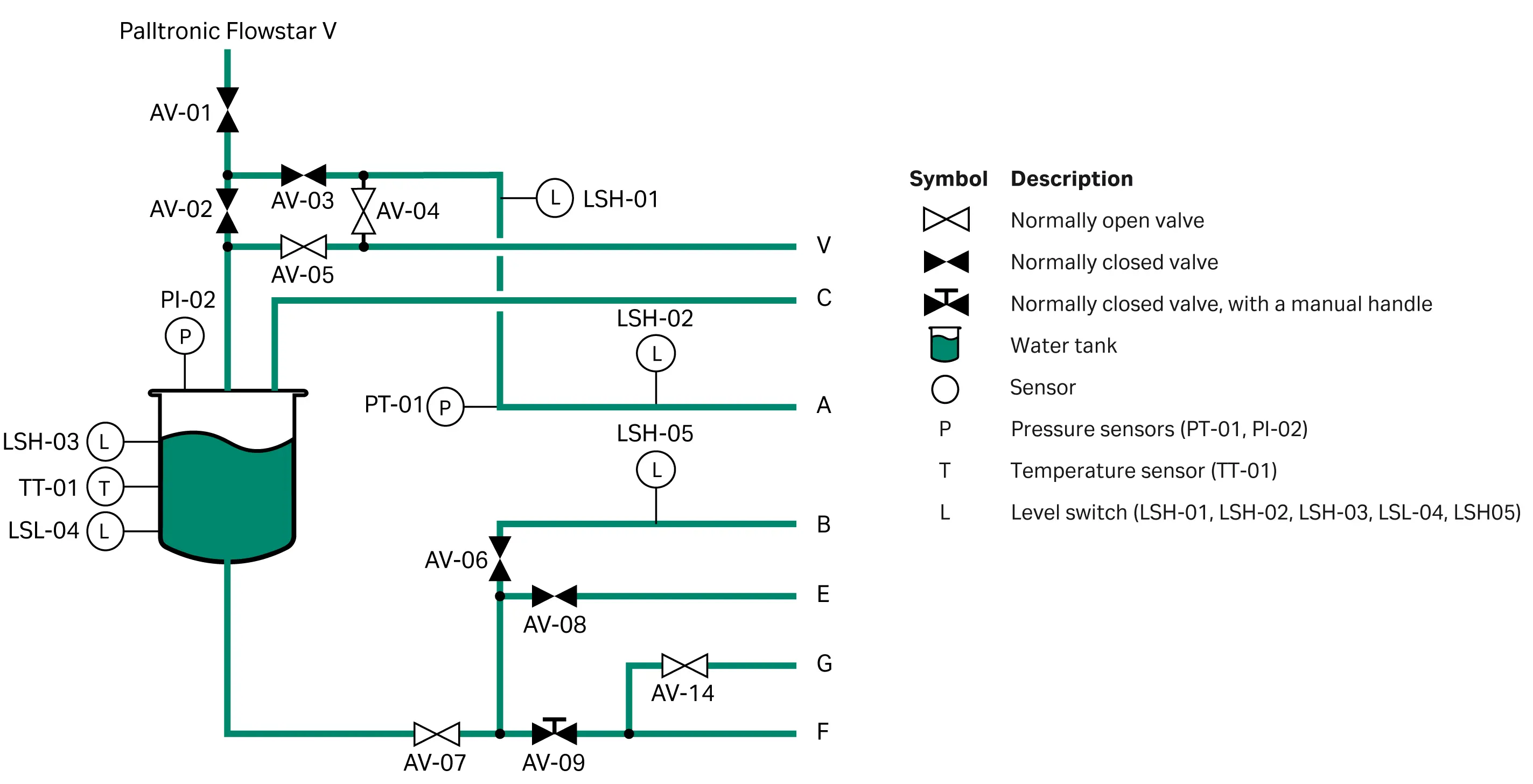 - The Palltronic Flowstar V instrument pressurizes the flow path with air to drain water from the flow path through port F to the waste line.