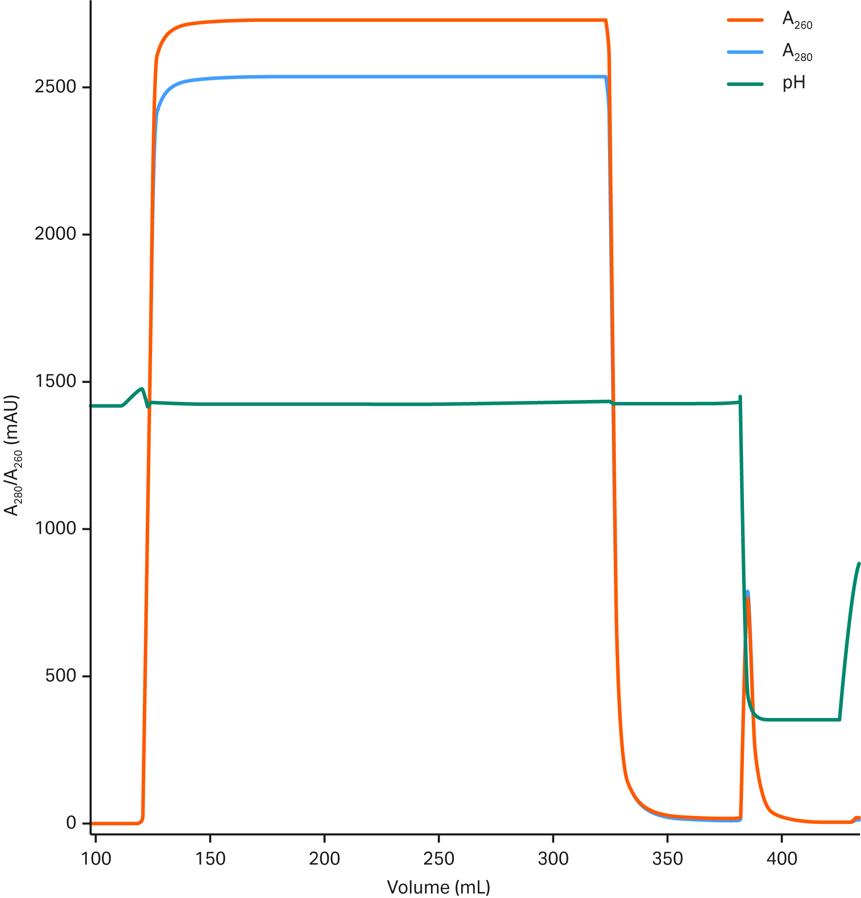 The pressure curve for this prepurified sample was similar to the curve for the clarified sample, which shows promise for scaling up scenarios. Also, if titers are lower, the sample volumes will exceed the 500 volumes shown previously. In Figure 5, 625 Fibro volumes were loaded, though this was still underloaded relative to the maximum capacity of the prototype.