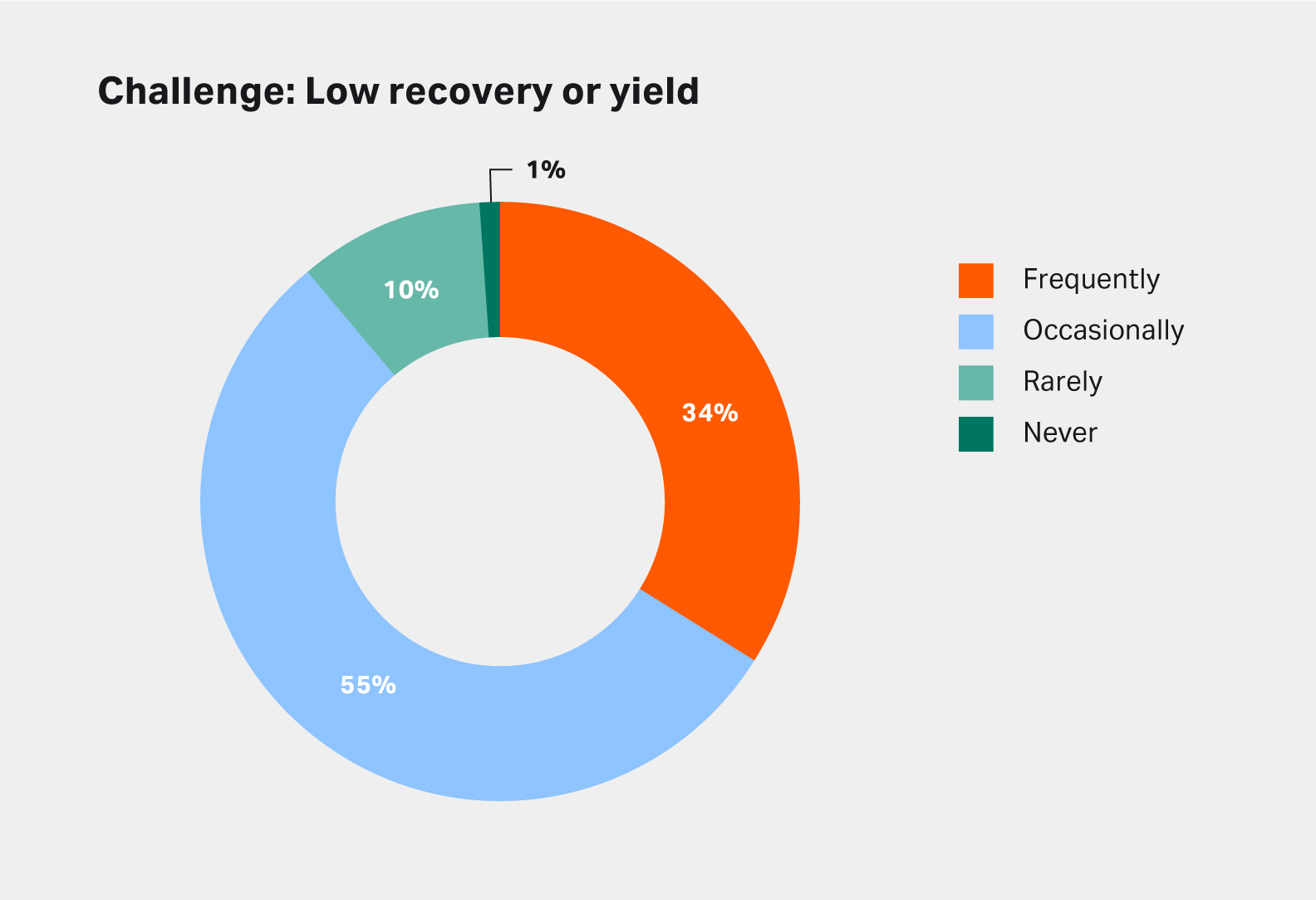 Fig 3. Low recovery (or yield) is one of the main challenges faced by researchers working with tagged protein purification. (Question asked: How often do you experience low yield/recovery challenges in your tagged protein purification work today?) Source: Survey performed in December 2021. Sample: 62.
