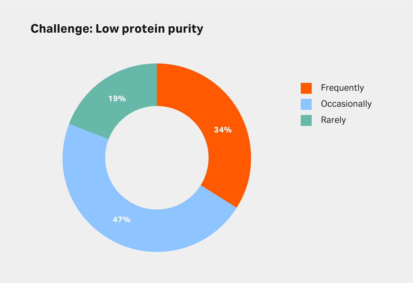 Fig 2. Low protein purity is a key challenge faced by researchers working with tagged protein purification. (Question asked: How often do you experience “Low protein purity” challenges in your tagged protein purification work today?) Source: Survey performed in December 2021. Sample: 62.