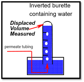 - For small, bench-scale systems, when the diffusive flow rate is ≤ 100 cubic centimeters (cc)/min, it is possible to measure the flow manually by measuring the volume displaced when the permeate line is placed into an inverted graduated burette in a beaker with water (refer to Fig 1). The volume of air displaced versus time will indicate the diffusive flow rate. With this method, it is best practice to take multiple measurements to confirm the integrity of the system.