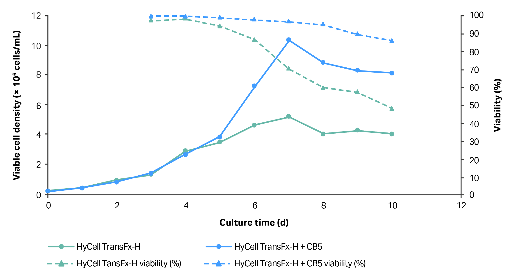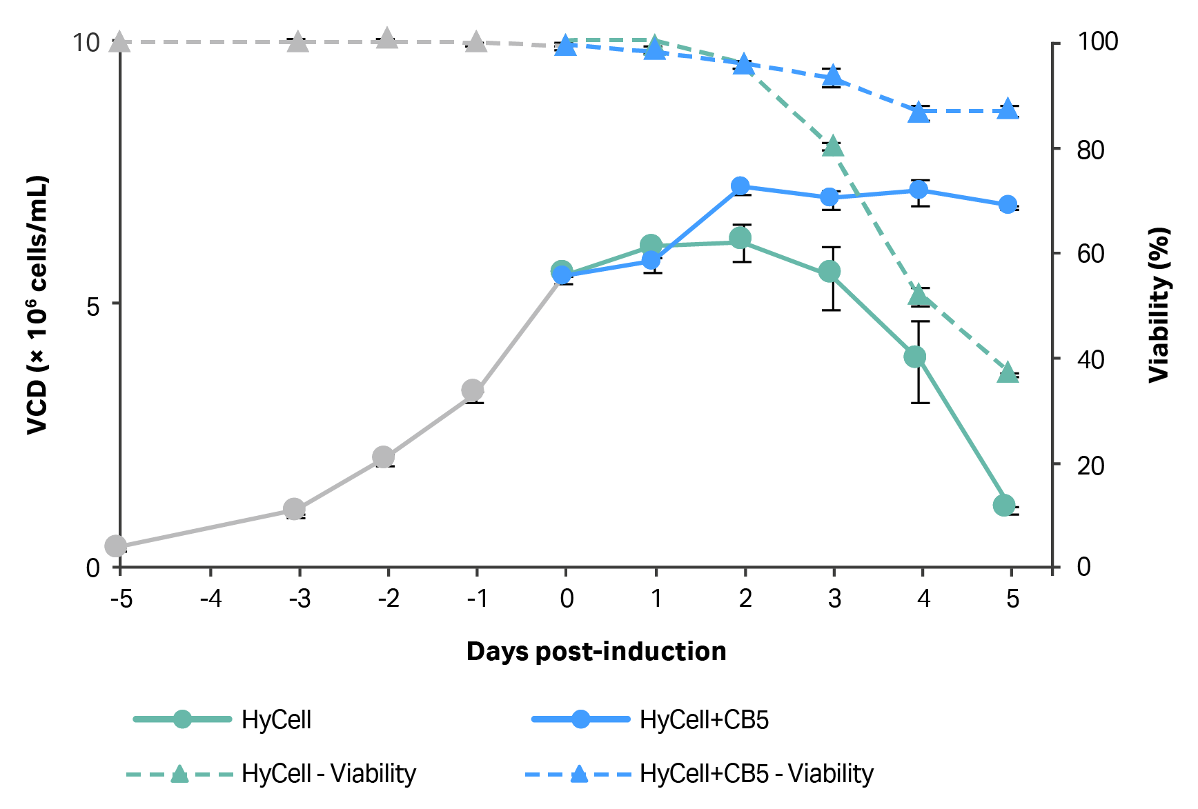 Fig 2. VCD and cell viability of clone 92 cells prior to and after induction of LV production in 20 mL cultures. Half of medium was replaced with HyCell TransFx-H or HyCell TransFx-H supplemented with CB5 (3.5 g/L), starting at 24 h after induction and every 24 h thereafter. N=2 (each data point is average of two readings from one process).
