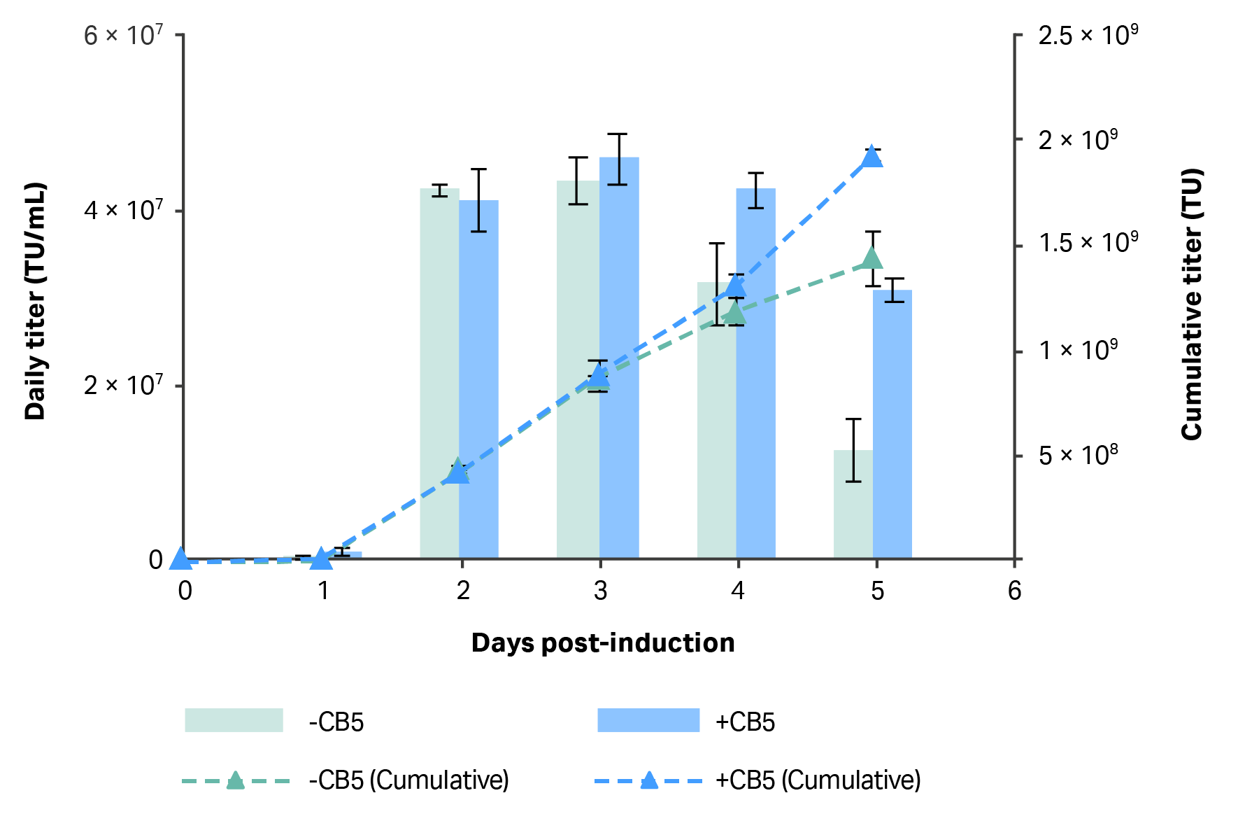 Fig 3. Daily volumetric vector titer (TU/mL) in 20 mL cultures where 50% of medium was replaced daily with fresh HyCell TransFx-H or HyCell TransFx-H supplemented with CB5 (3.5 g/L) starting at 24 h after induction. N=2, two technical samples to measure infectious titer (with three dilution replicates for each sample).