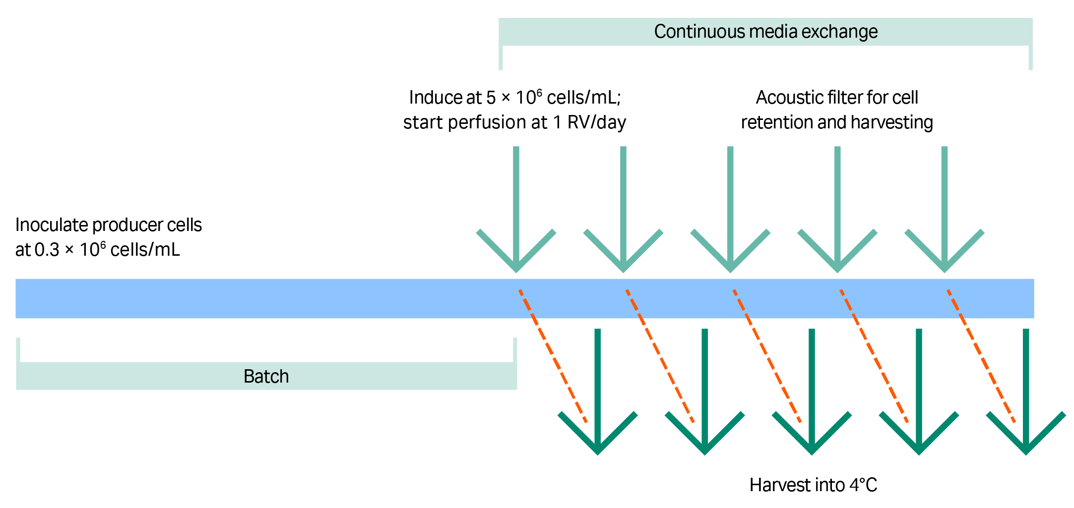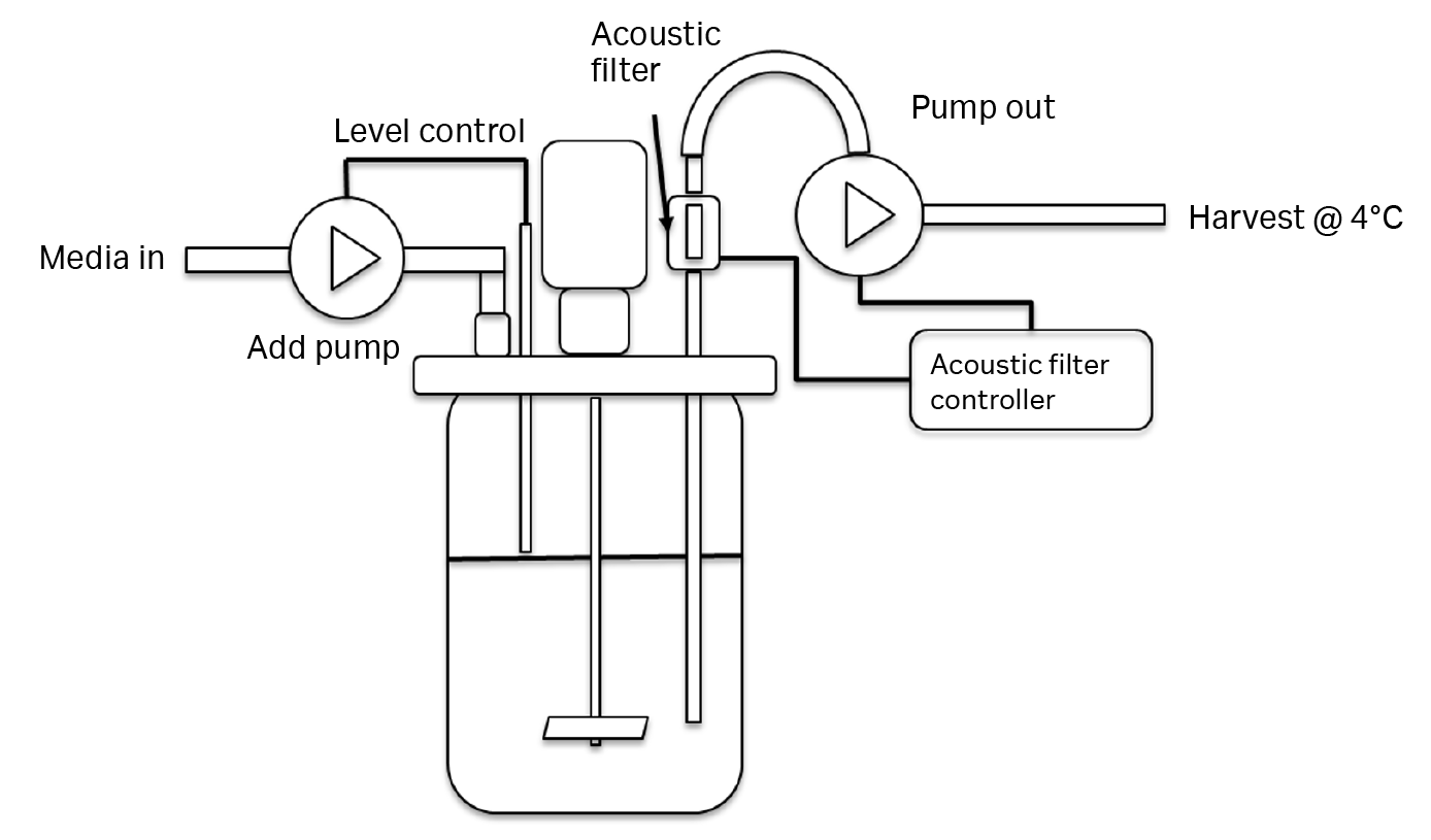 Filter type is critical for continuous harvesting of LV production strategies, because many perfusion filters have pores that are too small to accommodate LV passage (as we have observed in our laboratory). In this study, an acoustic filter was used for cell retention during perfusion and to allow LV to pass into the harvest (Fig 5). The spent medium containing the vectors was collected at 4°C in daily harvests that totaled one reactor volume per day.