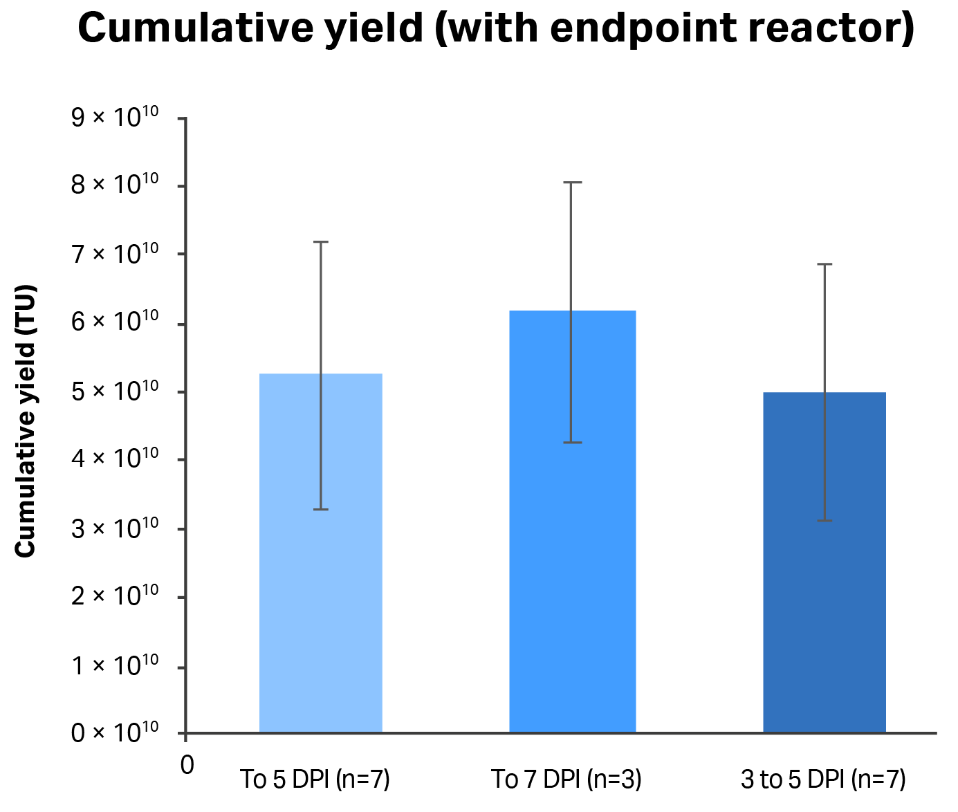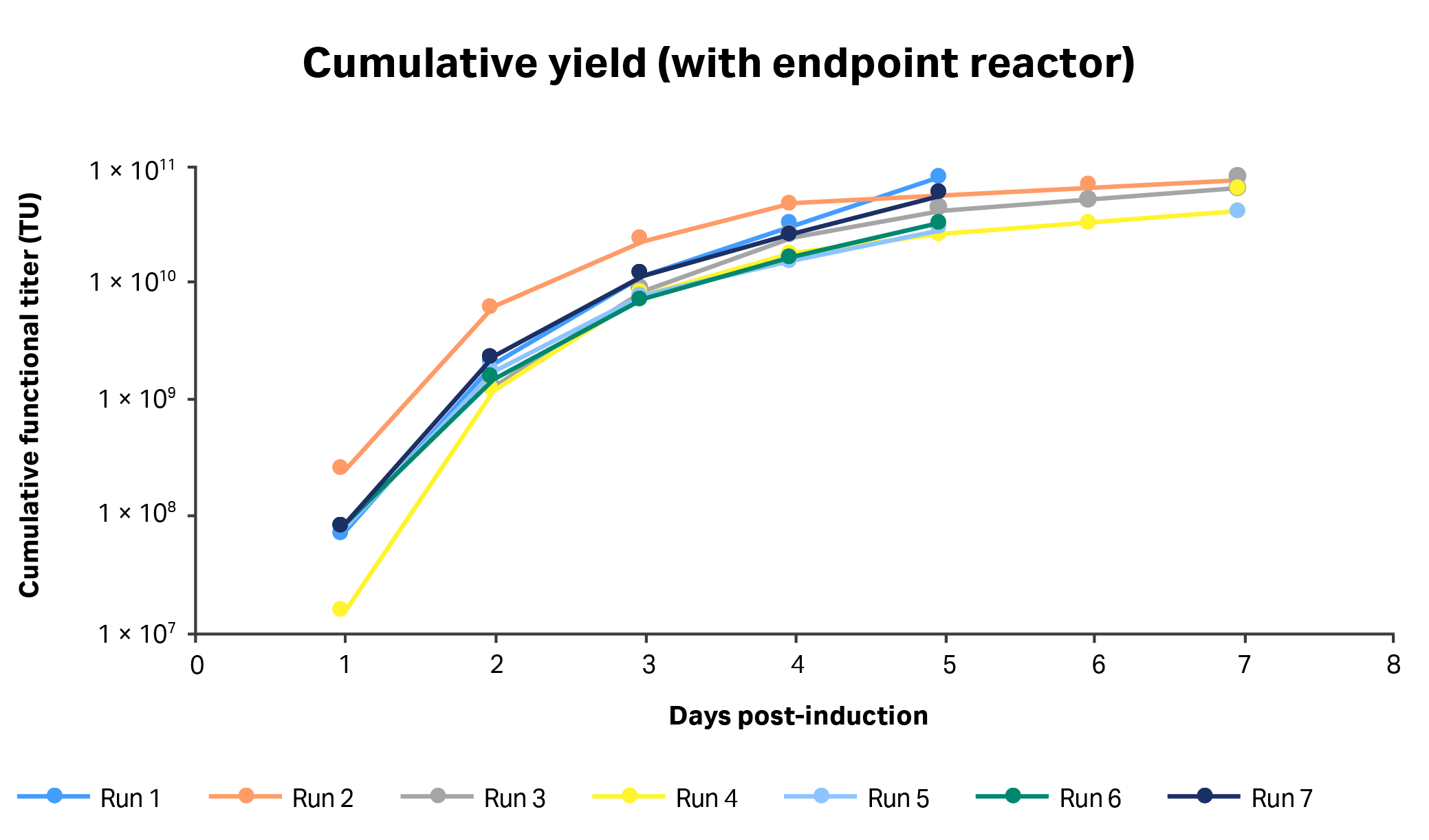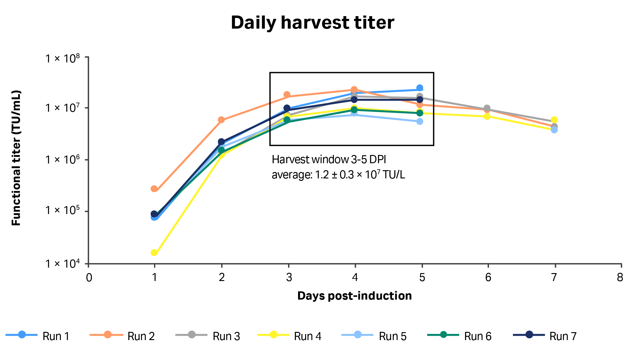 Fig 6. Daily volumetric vector titers (TU/mL) from each run in 1 L STR cultures using clone 92 cells and a perfusion-enabled process. Harvest windows: 3 to 5 d post-induction (DPI).
