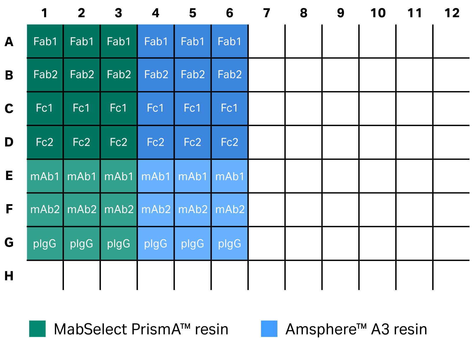Below, we briefly describe how the filter plate study was set up. In the plate study, two 96-well filter plates were filled with 6 µL/well of the two resins — MabSelect PrismA™ and Amsphere™ A3.