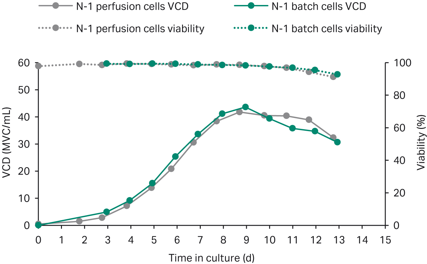We harvested a small fraction of the perfusion culture at 179 MVC/mL and used this to seed shake flasks cultured in fed-batch. For comparison, we seeded two shake-flasks using batch-cultured N-1 cells and cultured them using the same fed-batch process. The growth and productivity data from both batch and perfusion seeded fed-batch processes are shown in Figures 2 and 3, respectively. Growth, viability, and titers align well between perfused and batch-cultured cells, with a minor difference in titer that is within the normal batch-to-batch variation.