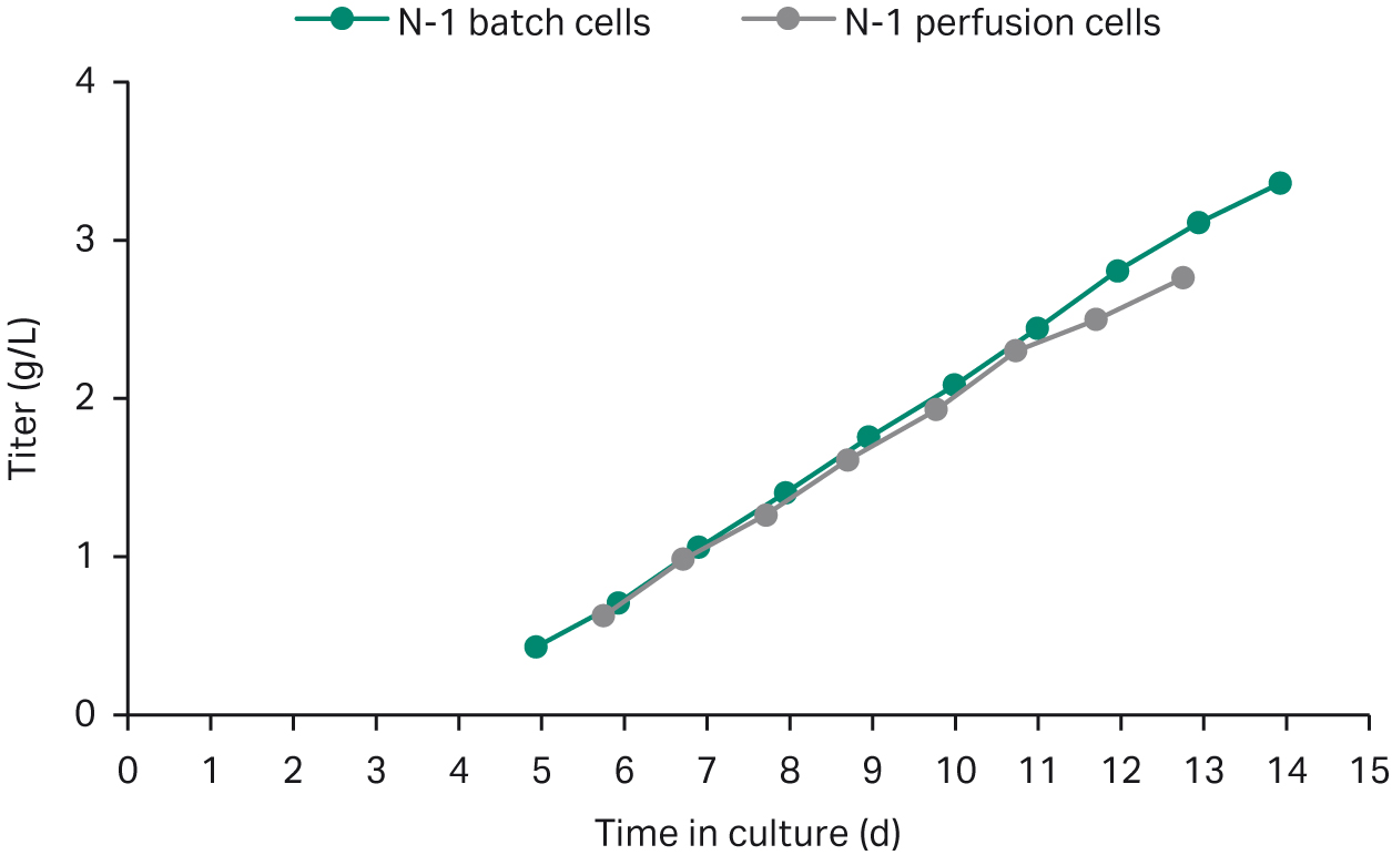 In this study, we thawed frozen mAb-producing CHO cells and subcultured them in shake flasks. Next, we transferred cells to a ReadyToProcess WAVE 25 bioreactor for the N-2 step. Then, we used this culture to seed an XDR-50 bioreactor for an N-1 perfusion step using the Xcellerex APS. Finally, we seeded fed-batch cultures in shake flasks using the perfused cells. We performed the fed-batch step as a proof of concept that cells retain their capacity to grow and produce after the intensified perfusion step in N-1.