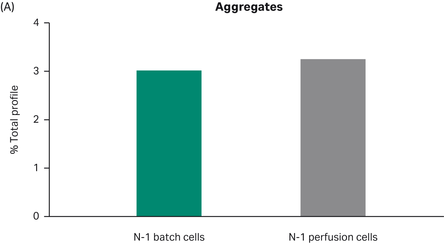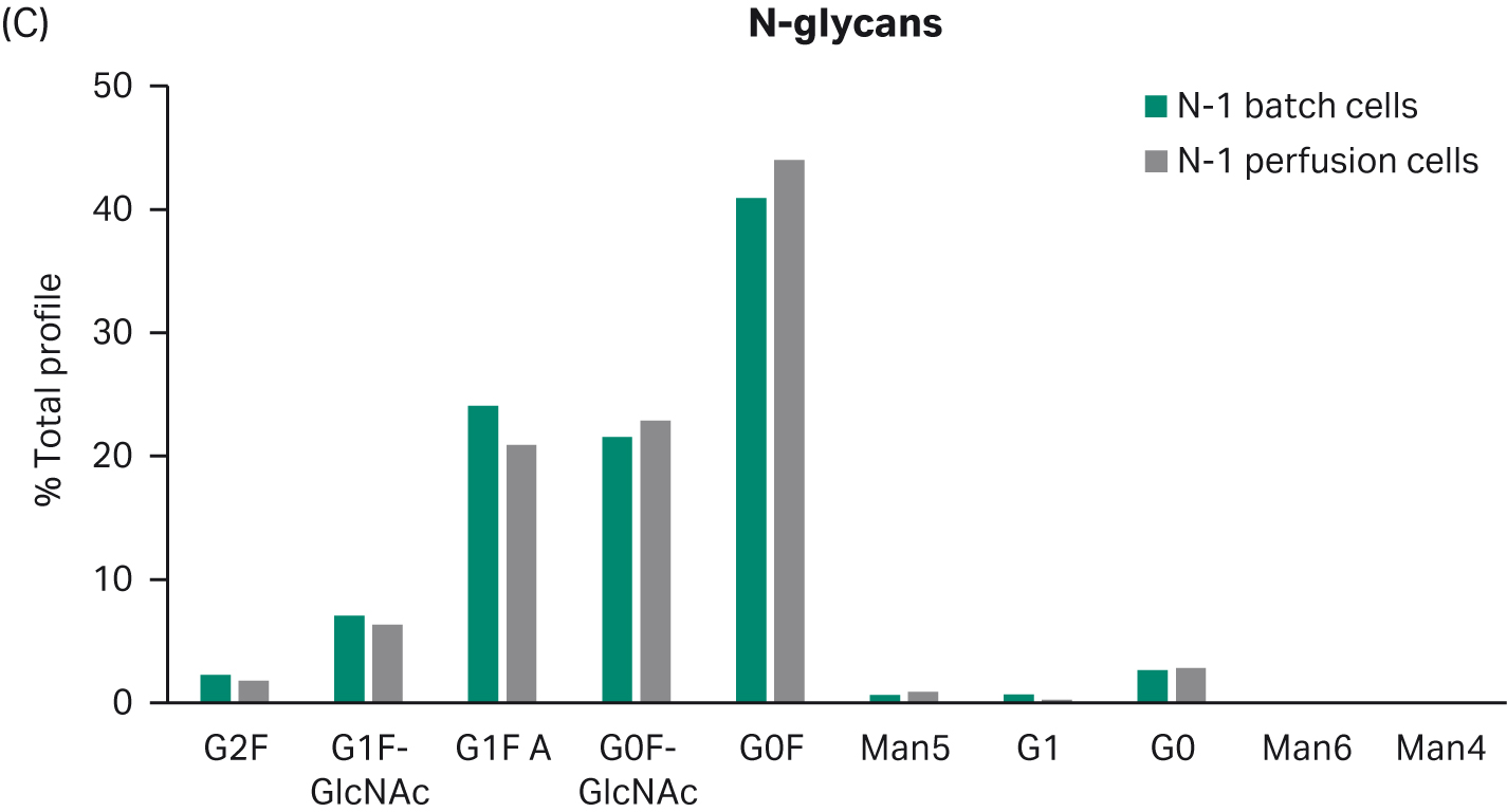 Fig 4. Product quality profiles for fed-batch cultures in shake flasks seeded with perfused cells and batch-cultured cells. (A) aggregates, (B) charge distribution, and (C) N-glycan profile.