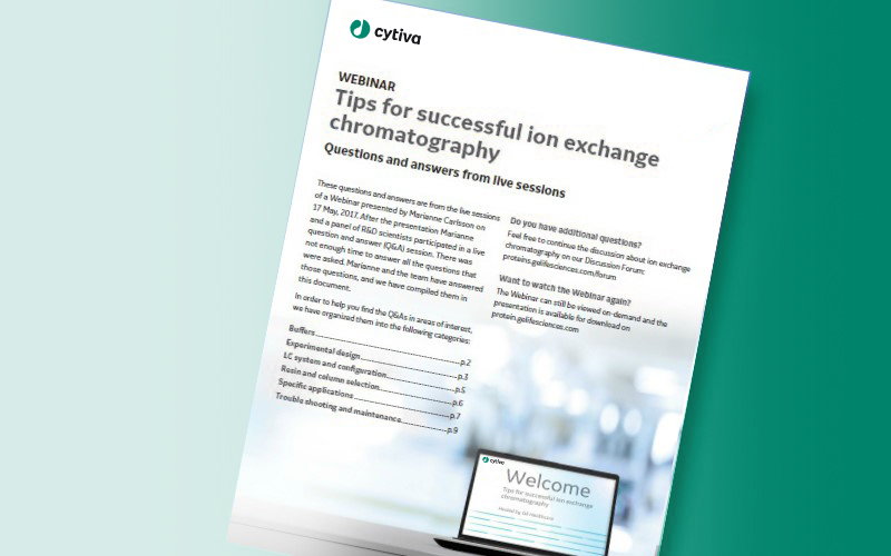 On 17 May 2017, Marianne Carlsson presented the webinar “Tips for successful ion exchange chromatography”. After the webinar, Marianne and a panel of R&D scientists participated in a live question and answer (Q&A) session. As there was not enough time to answer all the questions that were asked, Marianne went through them with the R&D team afterwards. We have compiled their answers into an interactive document.