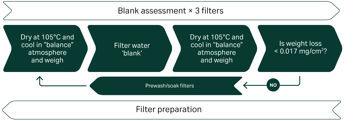 Because of the critical nature of the filter in this process, this (US) method states that it be binder free glass fiber and be prepared according to specific steps prior to use. Specifically, it should be rinsed three times, then dried and weighed until a constant weight is obtained. In testing for volatile suspended solids (VSS), the filter must also be ignited in a furnace at 550°C.