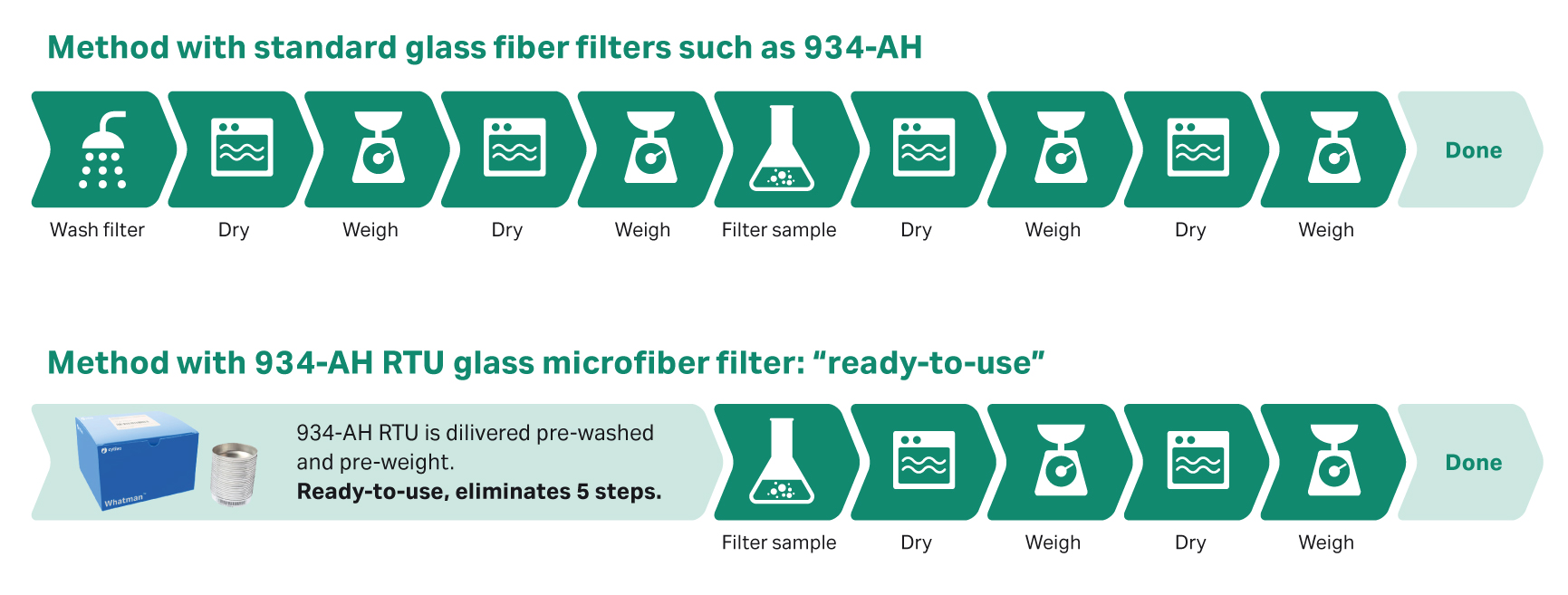 That’s where the Whatman™ 934-AH™ RTU (ready-to-use) filters by Cytiva come into play. These filters have been pre-treated to various degrees in accordance with US Standard Method 2540, saving time and costs compared to untreated filters. And with fewer steps in the filtration process, there is less room for human error, increasing confidence in the testing results.