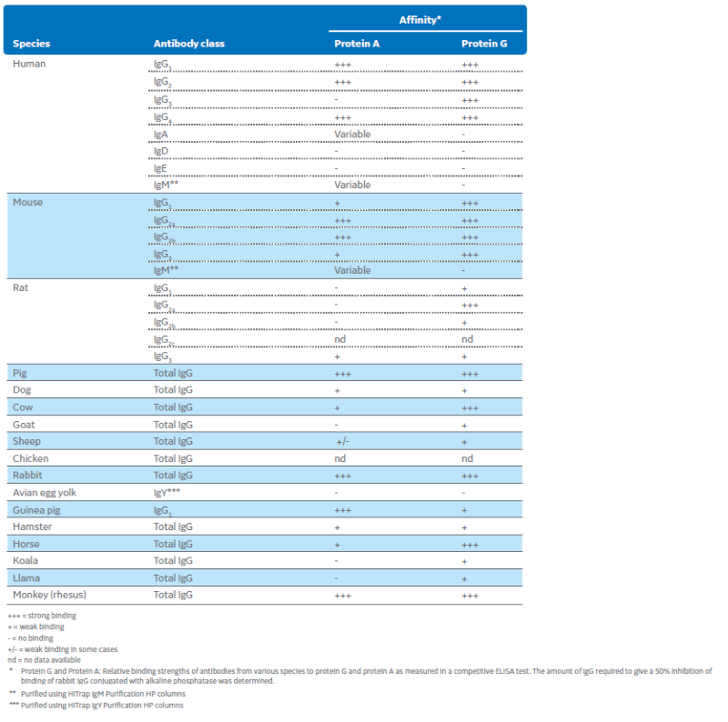 * Relative binding strengths of protein A and protein G