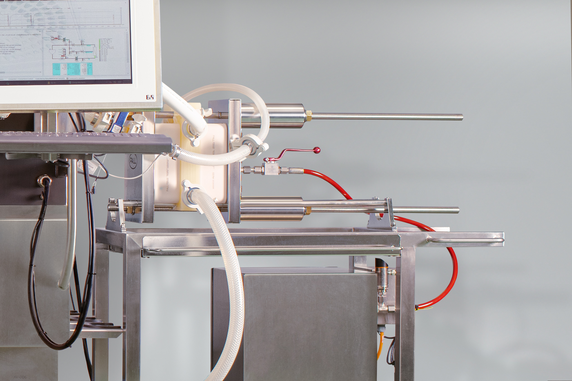 Fig 3. T-series Centrasette™ TFF cassettes in a holder connected to ÄKTA readyflux™ XL filtration system.