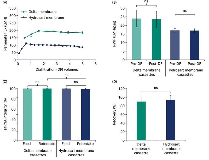 Fig 3. Diafiltration of crude mRNA. (A) Diafiltration of crude mRNA comparing the flux of Delta and Hydrosart membrane cassettes. (B) Normalized water permeability (NWP) at 20°C before and after diafiltration (DF). (C) mRNA integrity (main peak area) in feed and retentate pools. (D) Product recovery in the retentate pools after diafiltration. mRNA feed concentration was at ~ 0.5 g/L and loaded at 5 L/m2. Three independent cassettes (n = 3) were used for each cassette type. Diafiltration buffer: 10 mM TRIS and 1 mM EDTA, pH 7.5. Data represents mean ± S.D., n = 3. p-value: ns = not significant (p > 0.05). Statistical analyses were performed using Student’s t-test (unpaired, two-tailed).